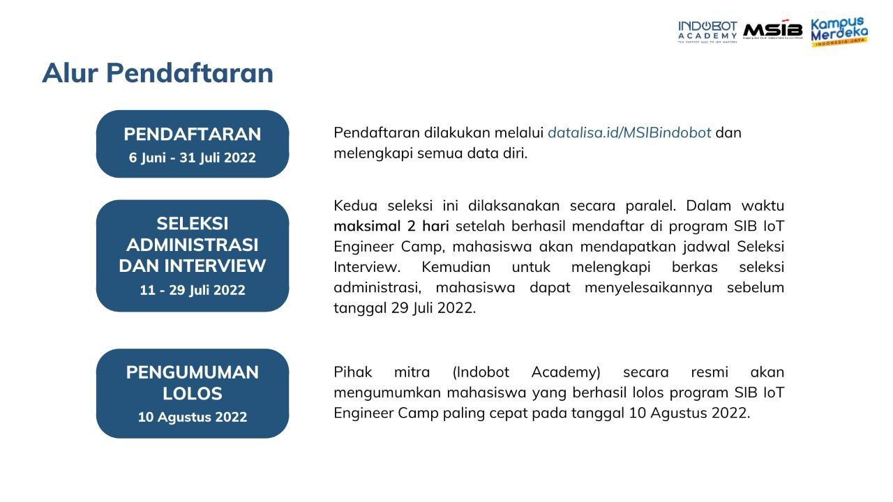 Periode Studi Independen yang dibuka Indobot Academy pada 25 Juli - 31 Desember 2022 masuk pada SIB Batch 3. Pada Batch ini Uang Saku tidak diberikan untuk Peserta. Namun jika Peserta Lolos dalam Program SIB Engineer Camp di Indobot Academy, akan mendapatkan benefit secara FREE berua KIT IoT.